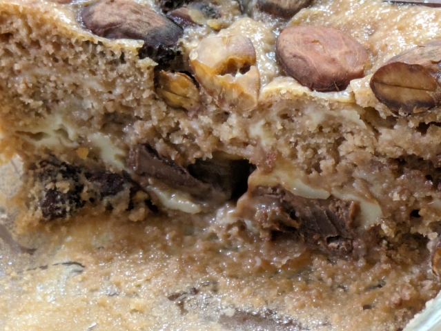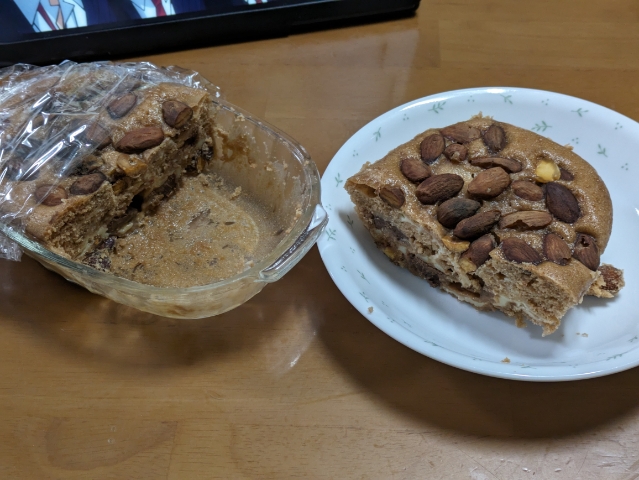 チョコ蒸しパン(小麦粉、ココアパウダー、はちみつ、ベーキングパウダー、ヨーグルト、ピーナッツ、ロッテのガーナ、ラム酒、ロッテのラミー)