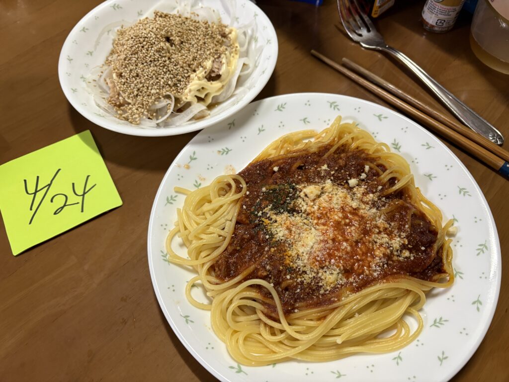 スパゲッティミートソース(粉チーズ、タバスコ、白ごま))