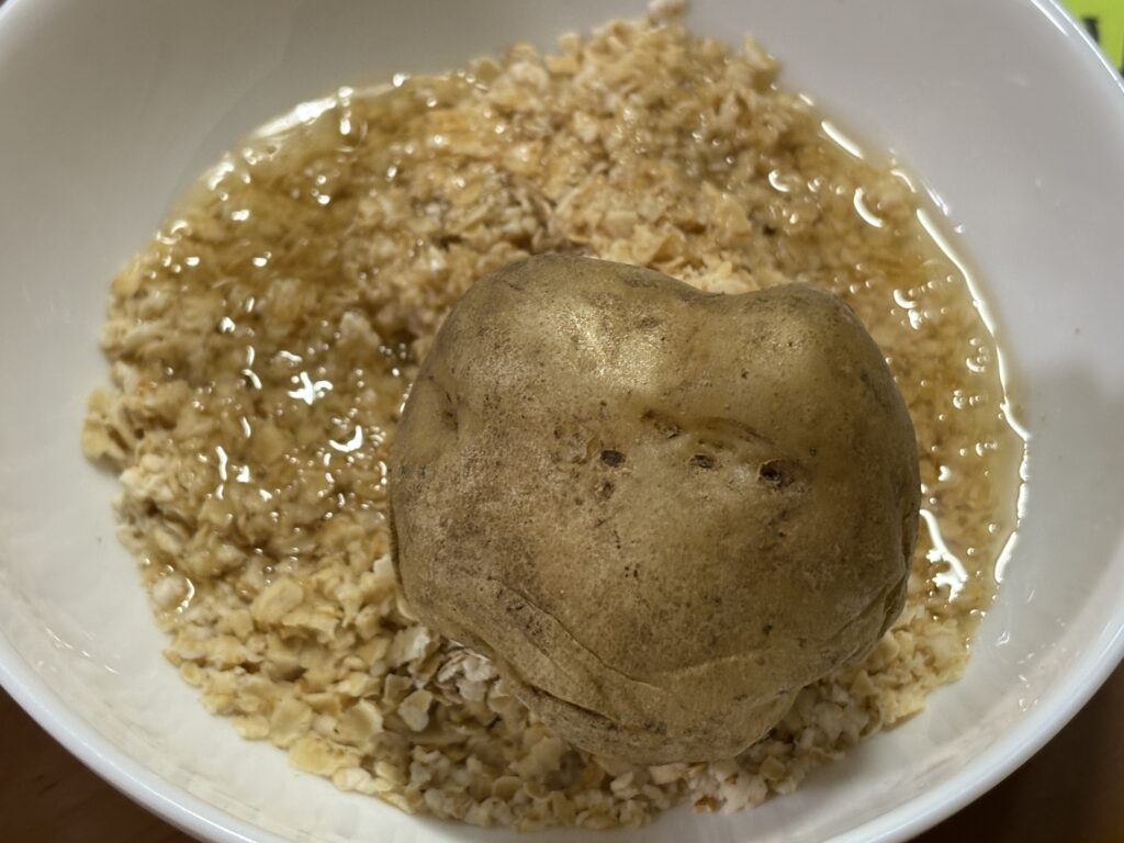 この段階で、あすけんアプリでPFCバランスをチェックしたら、炭水化物が不足していたため、オートミールとレンジで温めたじゃがいもで補充しました。