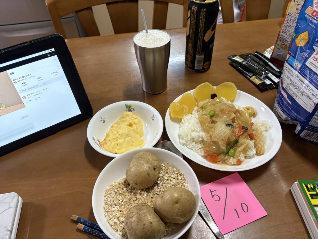 この段階で、あすけんアプリでPFCバランスをチェックしたら、炭水化物が不足していたため、オートミールとレンジで温めたじゃがいもで補充しました。