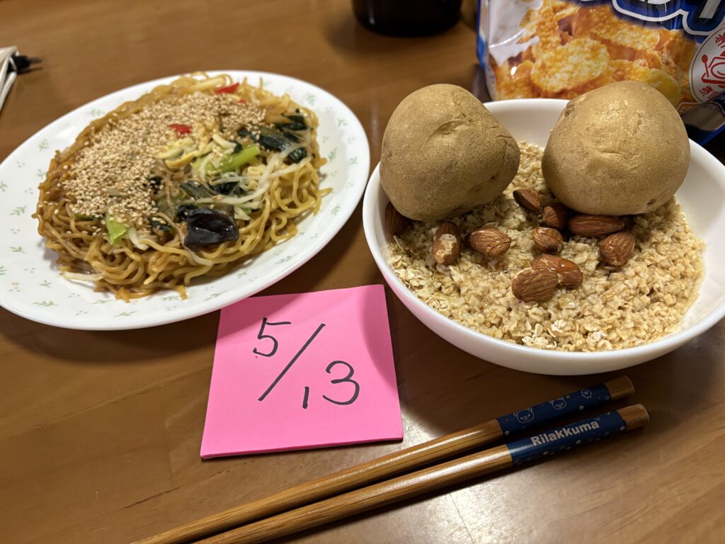 この段階で、あすけんアプリでPFCバランスをチェックしたら、炭水化物が不足していたため、オートミールとレンジで温めたじゃがいもで補充しました。