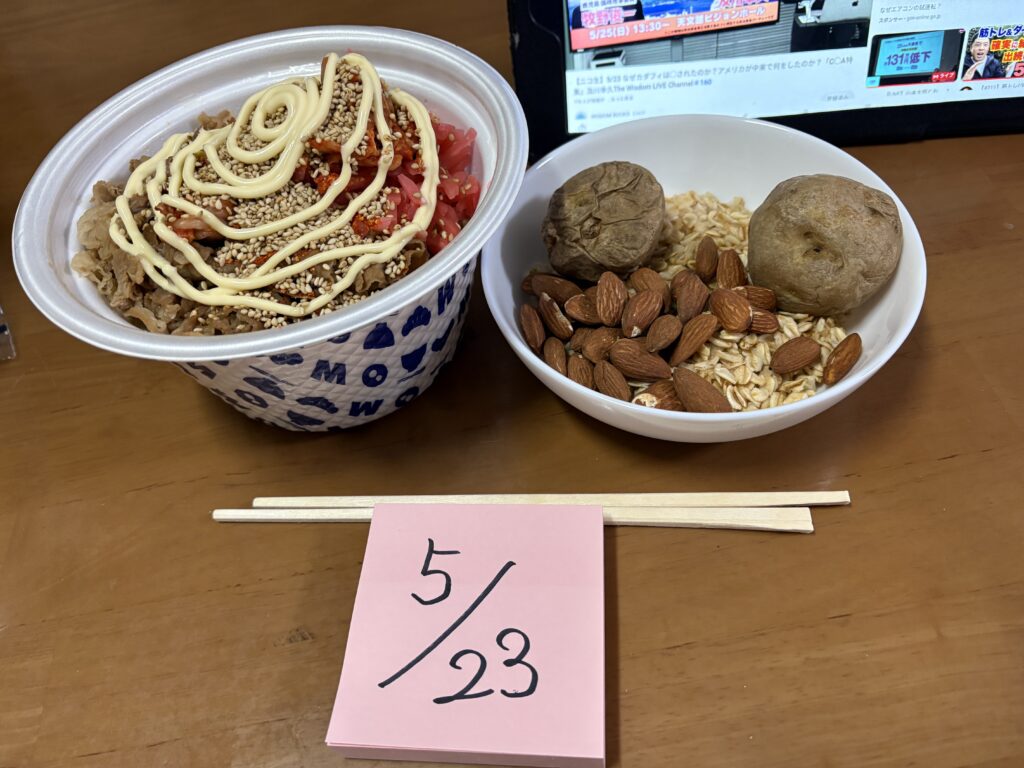 この段階で、あすけんアプリでPFCバランスをチェックしたら、炭水化物が不足していたため、オートミールとレンジで温めたじゃがいもで補充しました。