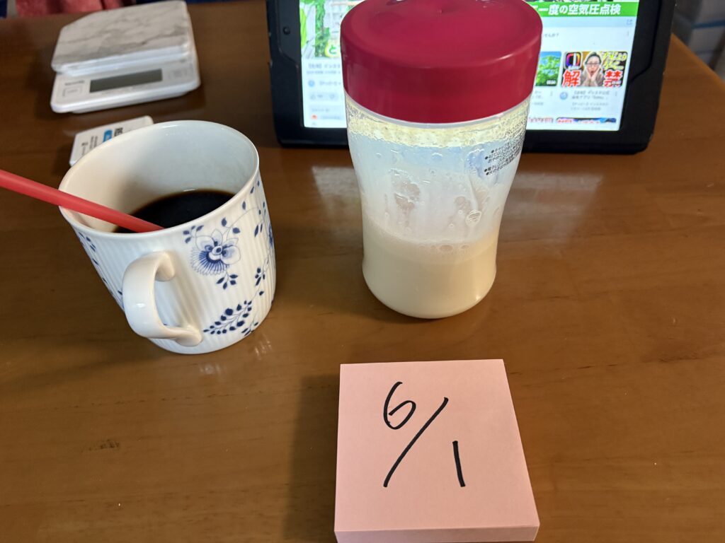 そして、ブラックコーヒー(200ml)で目と頭をシャキッとさせます。