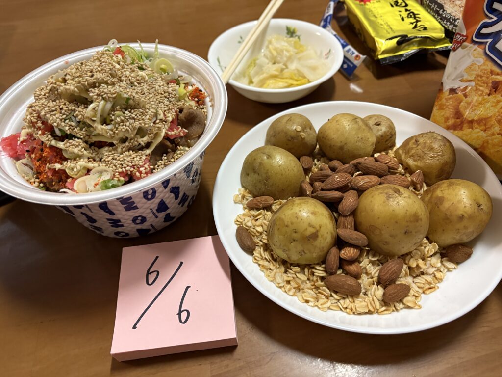 この段階で、あすけんアプリでPFCバランスをチェックしたら、炭水化物が不足していたため、オートミールとレンジで温めたじゃがいもで補充しました。