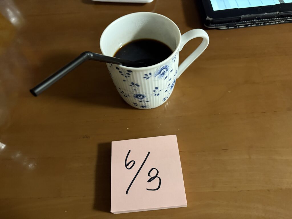ブラックコーヒー(200ml)で目と頭をシャキッとさせます。