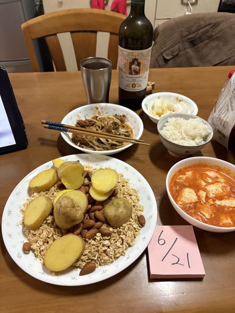 この段階で、あすけんアプリでPFCバランスをチェックしたら、炭水化物が不足していたため、オートミールとレンジで温めたじゃがいもで補充しました。