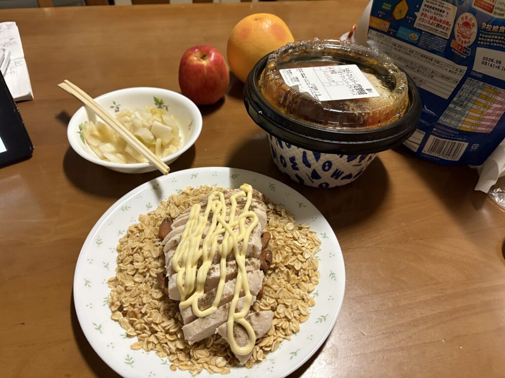 トッピングでアーモンドを載せ、さらに冷えたローソンで買ったサラダチキンを乗せマヨネーズと胡椒をかけて食べました。