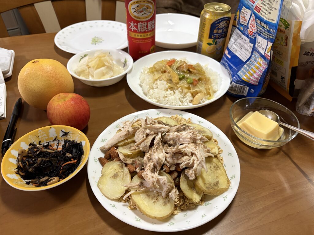 オートミールとレンジで温めたじゃがいもと鶏むね肉。