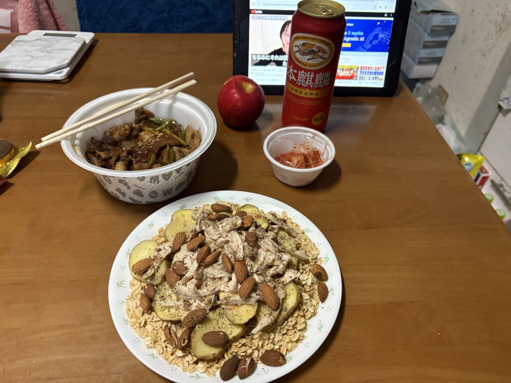 オートミールとレンジで温めたじゃがいもと鶏むね肉。