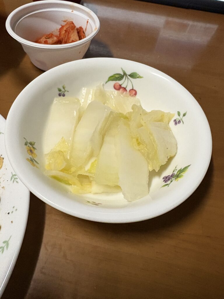 生卵に納豆(増えるわかめ)を加えて、そこにごはんと白菜漬、ねぎをのせてまぜまぜ