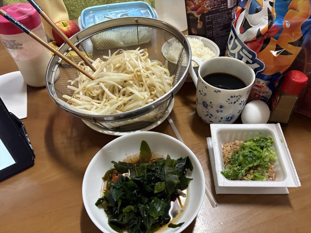 温野菜、今朝はもやしだけ。ただし、いつも一袋のところを二袋(消費期限切れがあったのでw)
