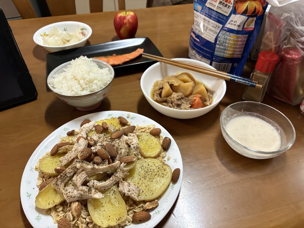 オートミールとレンジで温めたじゃがいもと鶏むね肉。