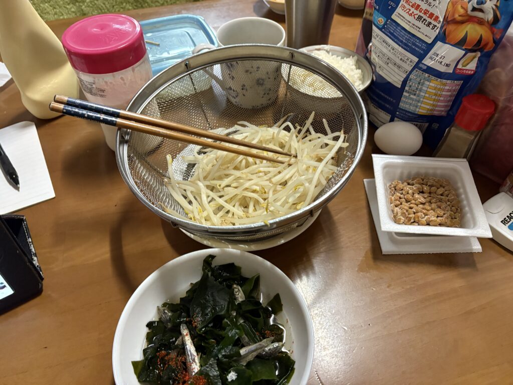 生卵に納豆(増えるわかめ)を加えて、そこにごはんと白菜漬、ねぎをのせてまぜまぜ