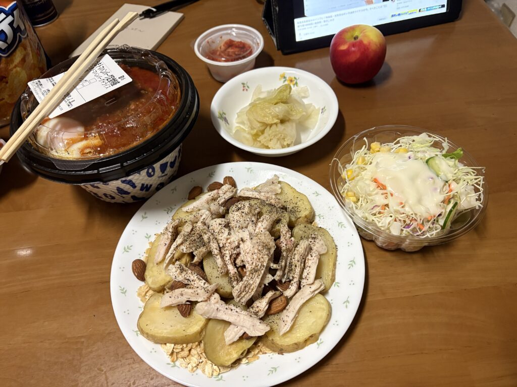オートミールとレンジで温めたじゃがいもと鶏むね肉。