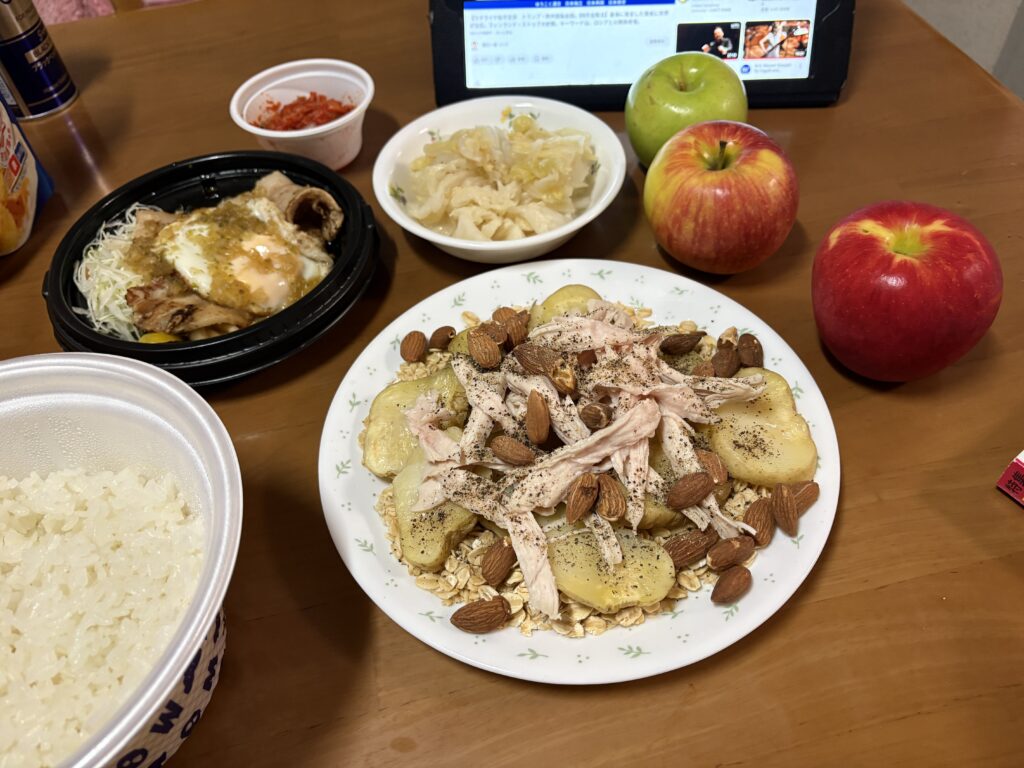 オートミールとレンジで温めたじゃがいもと鶏むね肉。