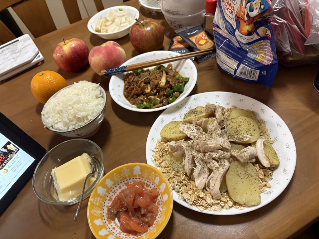 オートミールとレンジで温めたじゃがいもと鶏むね肉。
