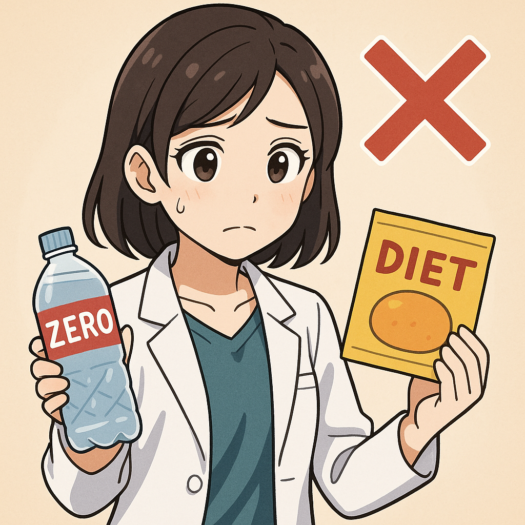 - 人工甘味料(アスパルテーム) ? 発がん性リスクや代謝異常との関連が研究で報告されており、妊娠中や子どもは特に避けたい。