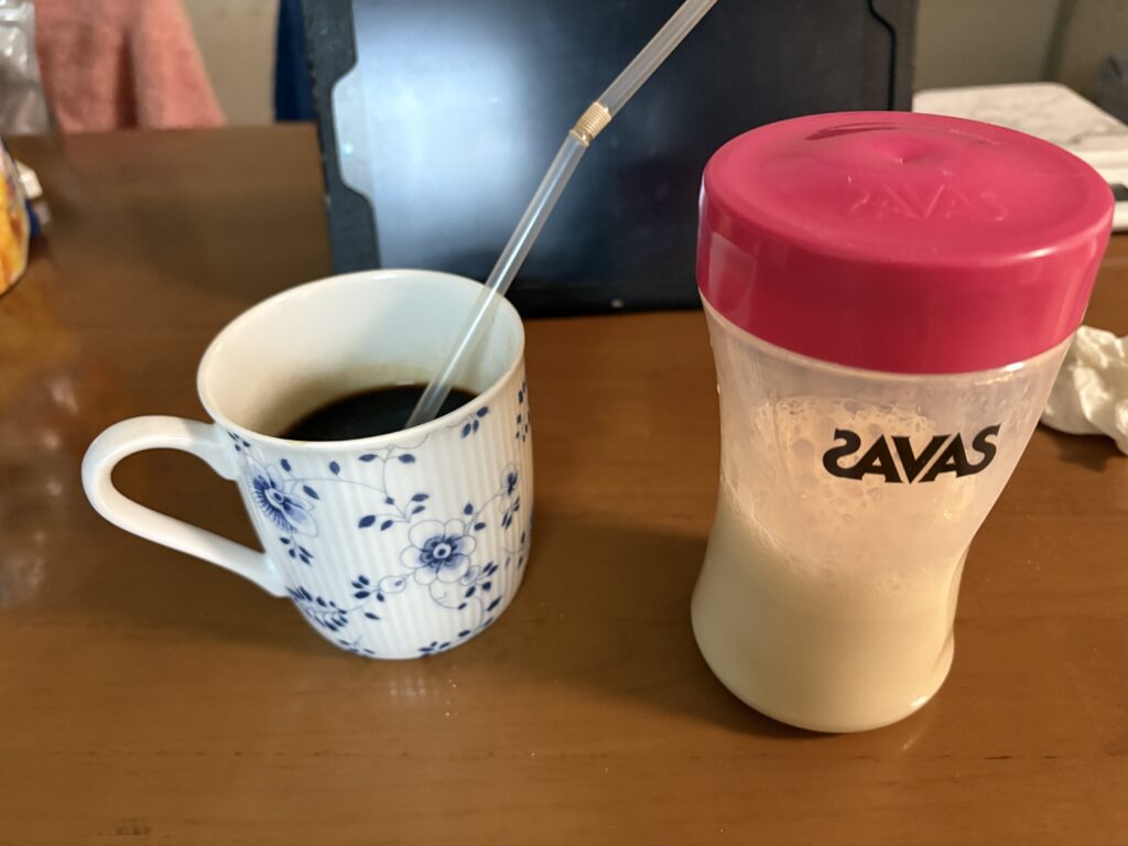 ブラックコーヒー(200ml)で目と頭をシャキッとさせます。