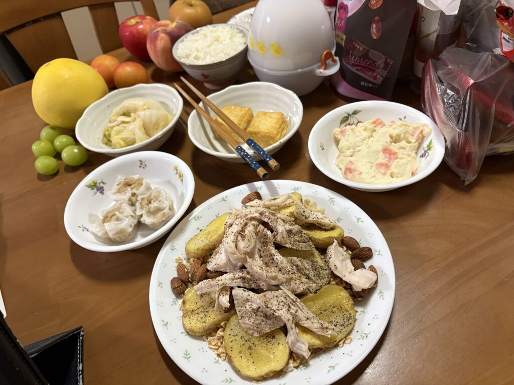 オートミールとレンジで温めたじゃがいもと鶏むね肉。