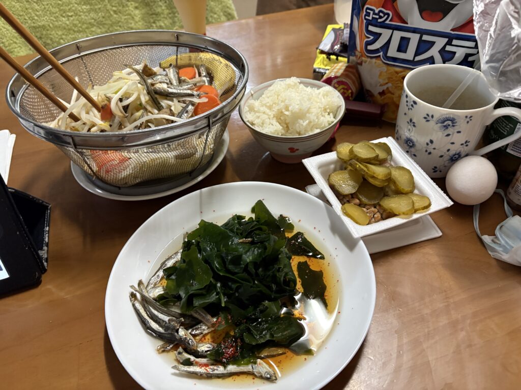 生卵に納豆(増えるわかめ)を加えて、そこにごはんとピクルスをのせてまぜまぜ