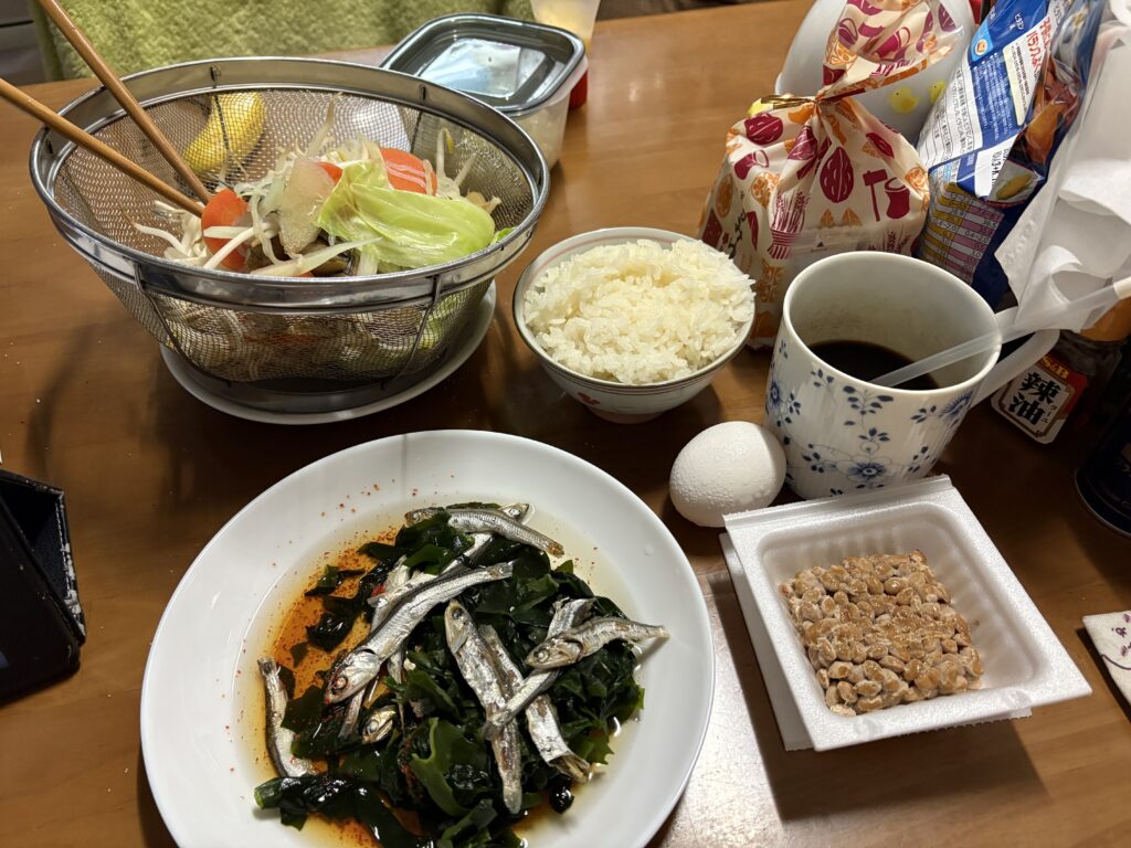 生卵に納豆(増えるわかめ)を加えて、そこにごはんとねぎをのせてまぜまぜ
