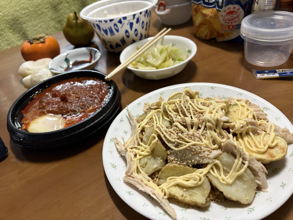 オートミールとレンジで温めたじゃがいもと鶏むね肉。
