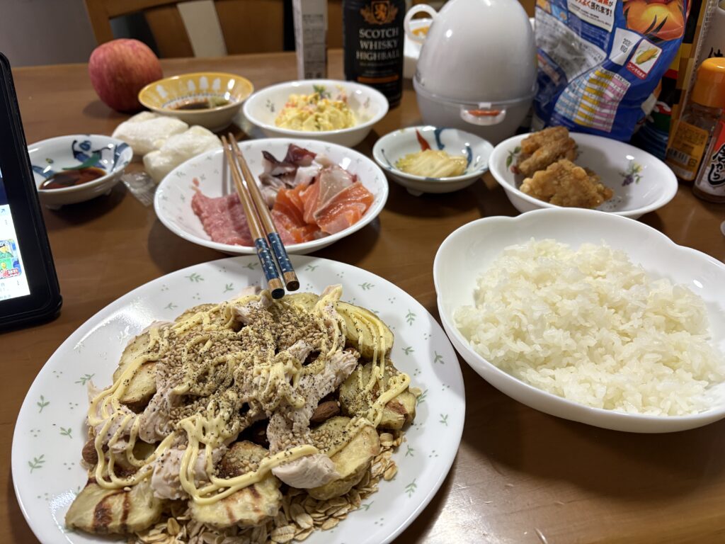 オートミールとレンジで温めたじゃがいもと鶏むね肉。