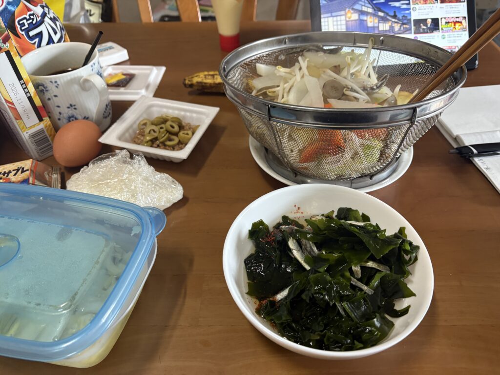 煮干しとわかめを入れた酢醤油に茹でたもやしで頂きます。