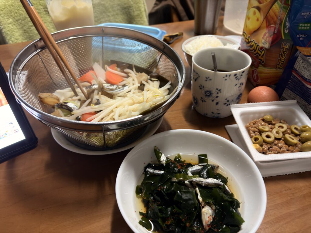 煮干しとわかめを入れた酢醤油に茹でたもやしで頂きます。
