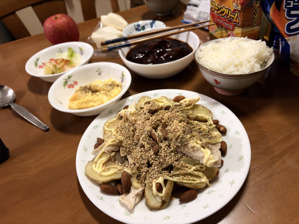 オートミールとレンジで温めたじゃがいもと鶏むね肉。
