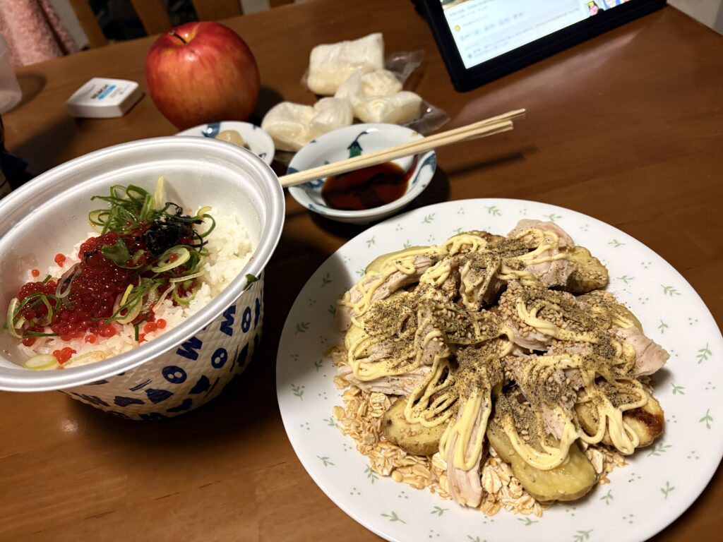 オートミールとレンジで温めたじゃがいもと鶏むね肉。