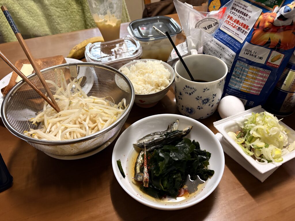 煮干しとわかめを入れた酢醤油に茹でたもやしで頂きます。