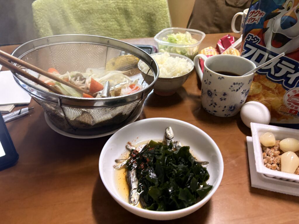 煮干しとわかめを入れた酢醤油に茹でたもやしで頂きます。