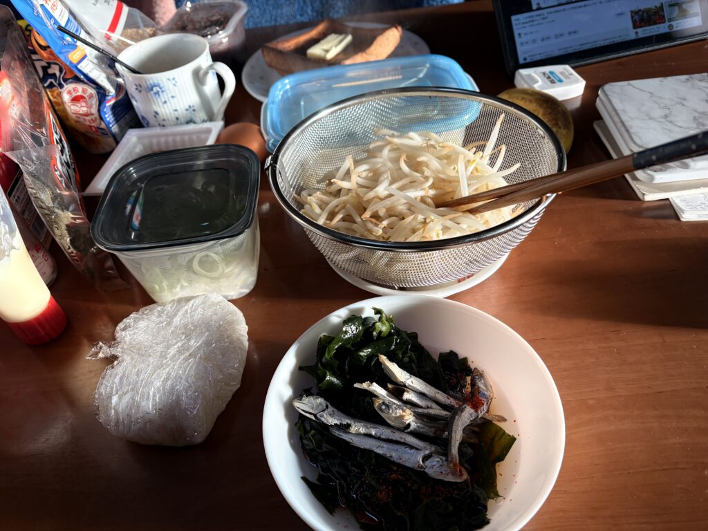 煮干しとわかめを入れた酢醤油に茹でたもやしで頂きます。