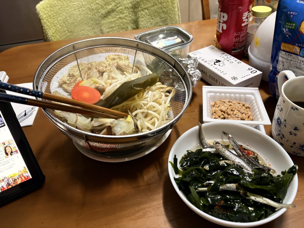 煮干しとわかめを入れた酢醤油に茹でたもやしで頂きます。