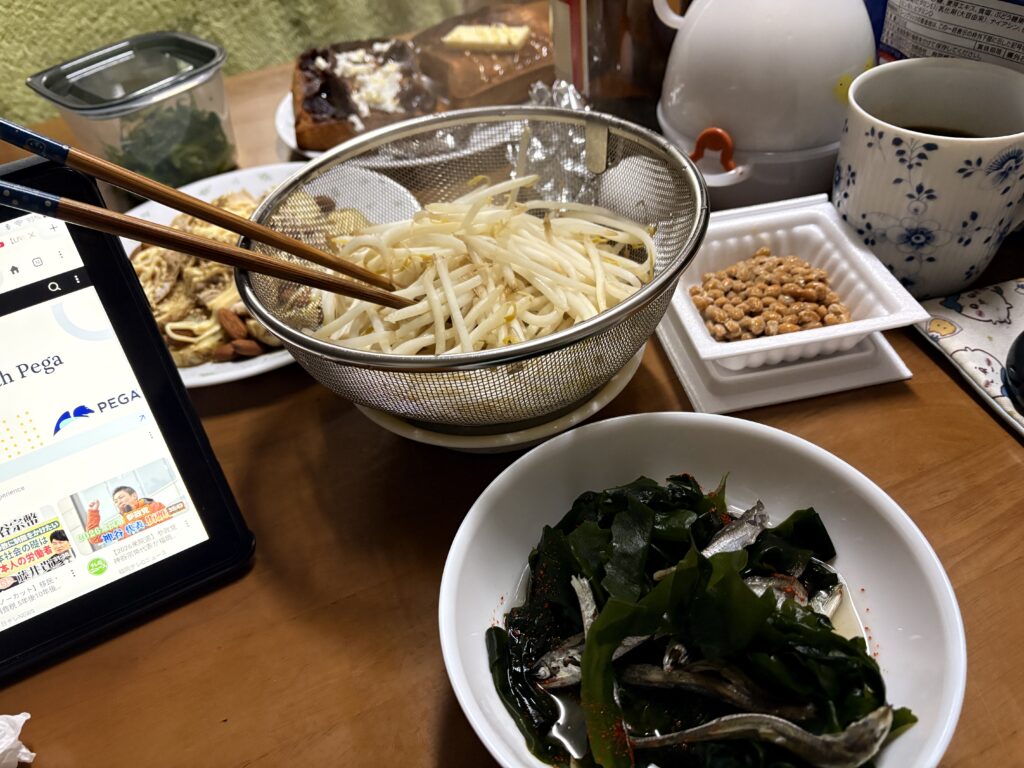 煮干しとわかめを入れた酢醤油に茹でたもやしで頂きます。