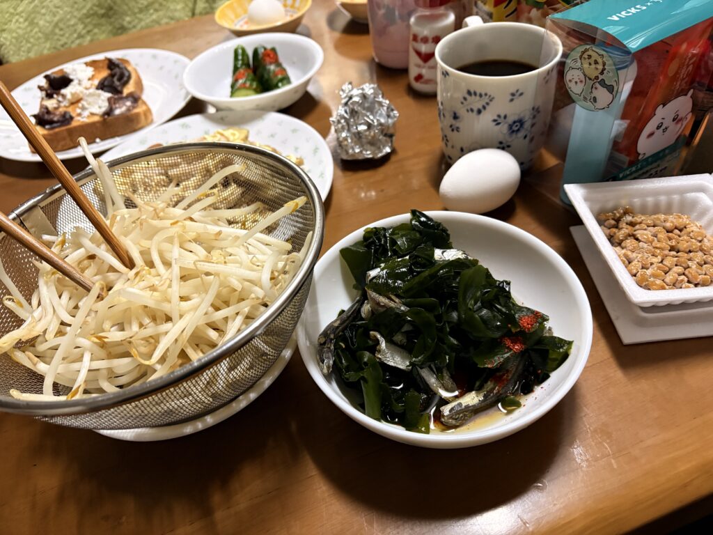 煮干しとわかめを入れた酢醤油に茹でたもやしで頂きます。