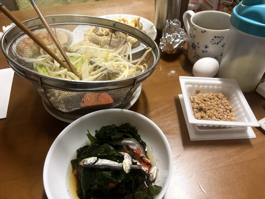 煮干しとわかめを入れた酢醤油に茹でたもやしで頂きます。