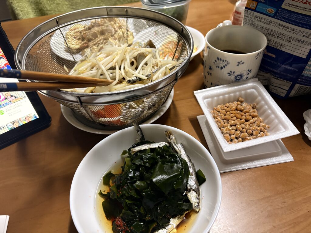 煮干しとわかめを入れた酢醤油に茹でたもやしで頂きます。