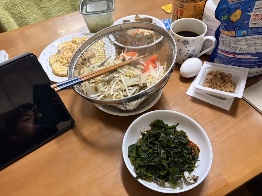 煮干しとわかめを入れた酢醤油に茹でたもやしで頂きます。