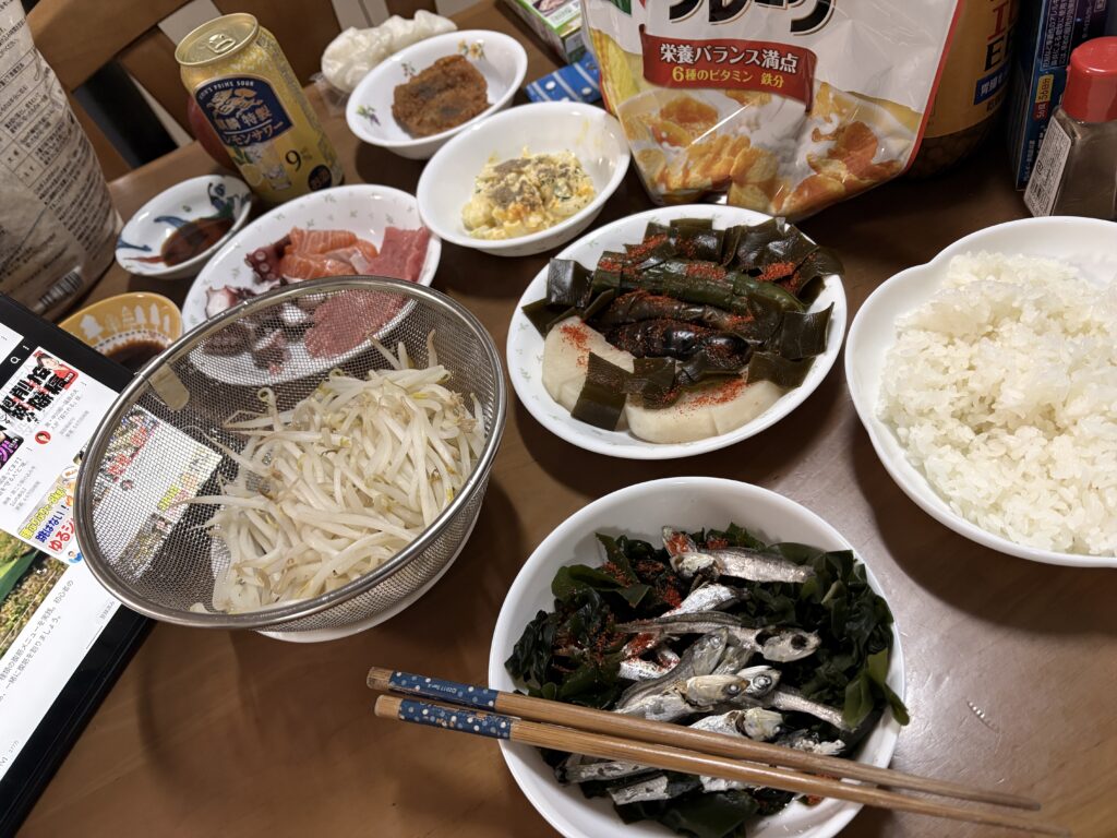 ワカメと煮干しに酢醤油を加えたものに、湯がいたもやしで頂きました。