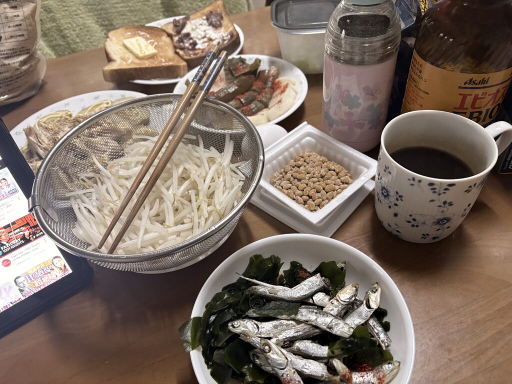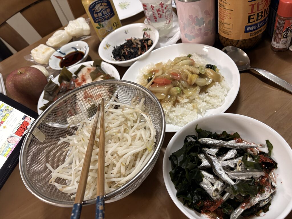 ワカメと煮干しに酢醤油を加えたものに、湯がいたもやしで頂きました。