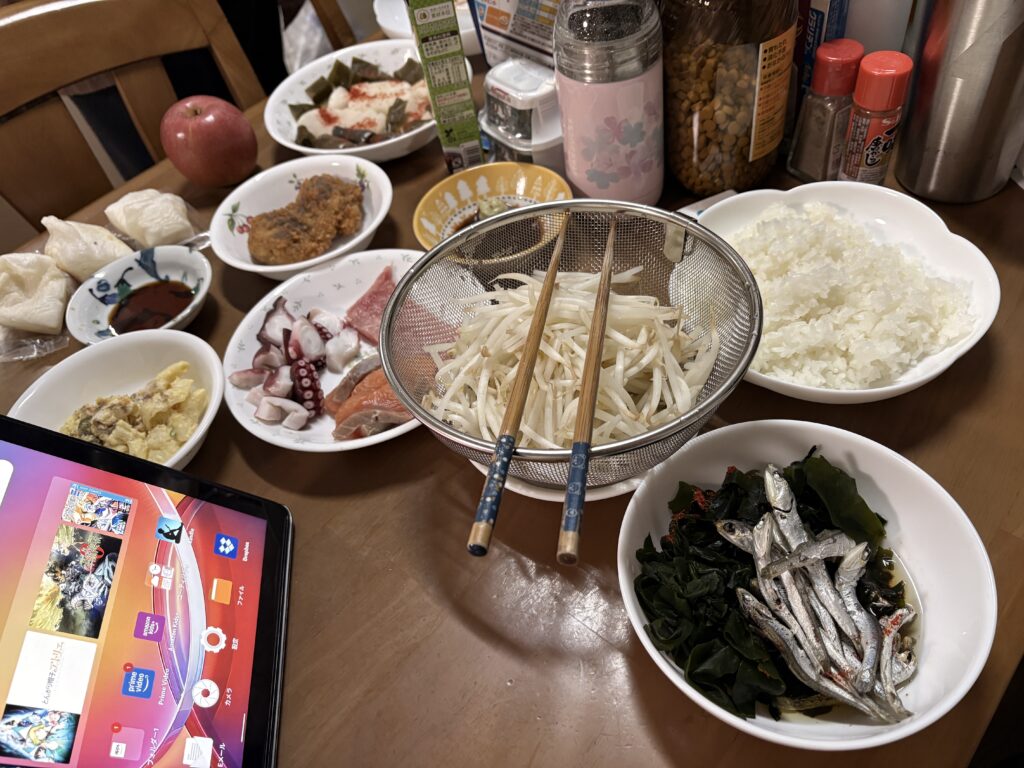 ワカメと煮干しに酢醤油を加えたものに、湯がいたもやしで頂きました。