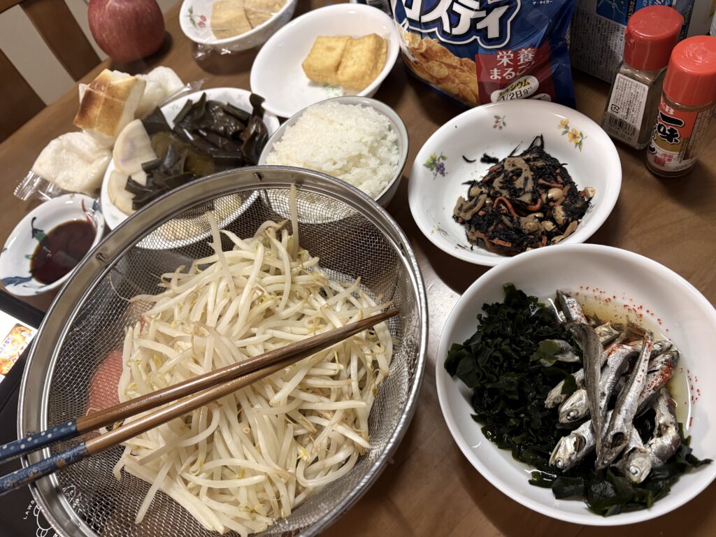 ワカメと煮干しに酢醤油を加えたものに、湯がいたもやしで頂きました。