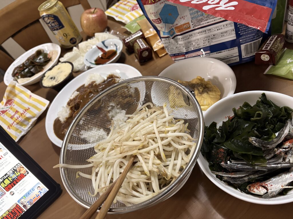 ワカメと煮干しに酢醤油を加えたものに、湯がいたもやしで頂きました。
