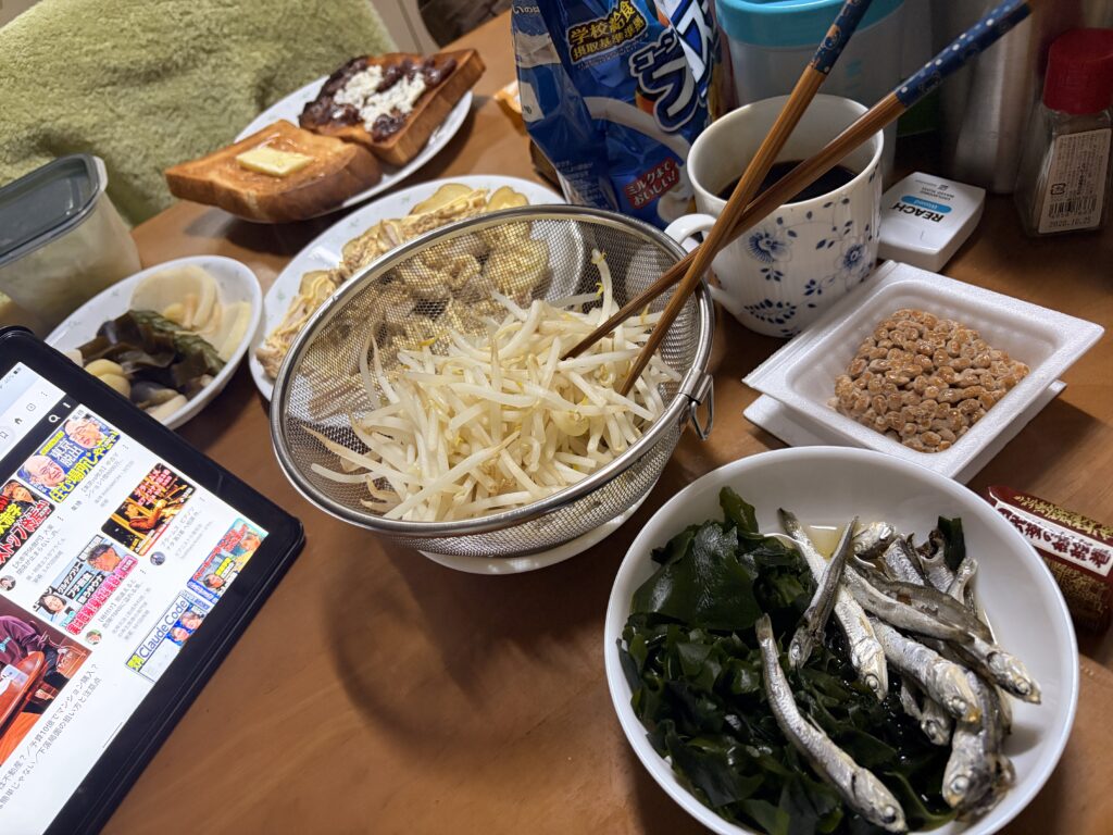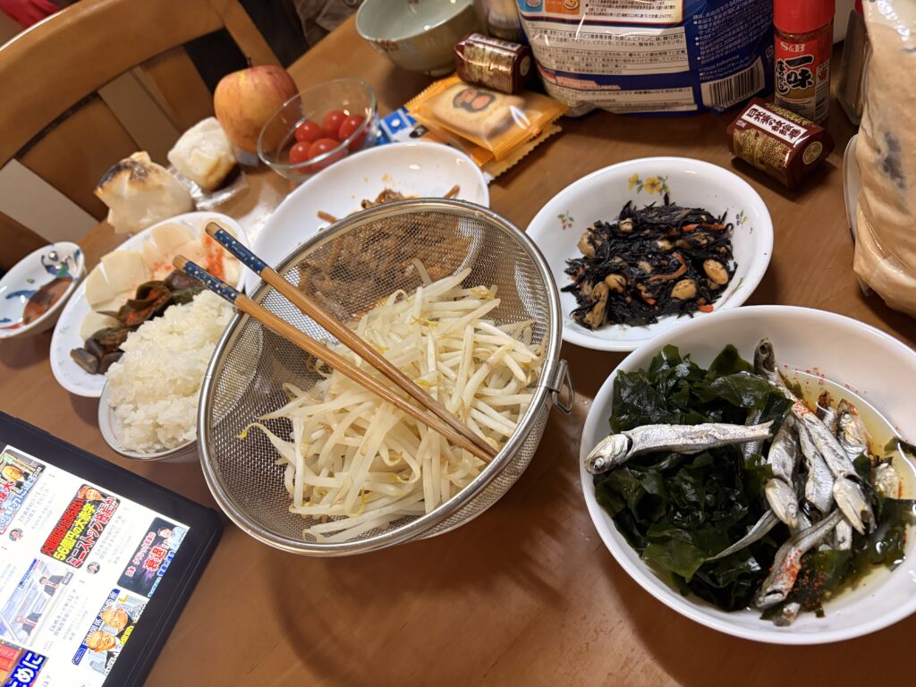 ワカメと煮干しに酢醤油を加えたものに、湯がいたもやしで頂きました。
